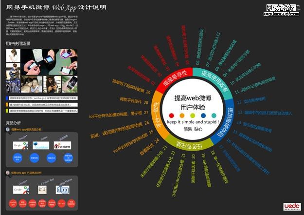 該產品具體的交互設計理念來源於:用戶使用場景的調查、競品分析、Web App研發現狀、微博Web App的自身要求。最終歸納得出的交互設計理念主要有: