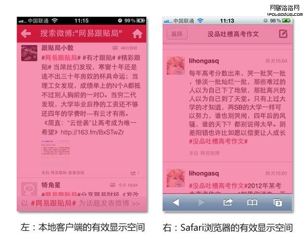 通過safari浏覽器使用網易微博Web App,最終的視覺效果與本地客戶端還有一個區別是,浏覽器工具欄一直占據著屏幕的底部一行空間。紅色屬於比較“喧囂”的顏色,浏覽器的工具欄藍灰色相對“沉靜”。這兩種顏色巨大的差距造成眼鏡極度不適。