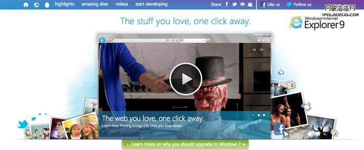 在beautyoftheweb網站上,可以下載到40種語言的IE9 RC版(開發者體驗版),通過Bautyoftheweb,開發人員和愛好者即可有規律地對IE9平台上的HTML5實現效果進行預覽,目前,此網站上的IE9 RC版可以直接下載,同時還可以看線上指導視頻,就算非開發者,程序員也能通過視頻,領略到HTML5在IE9平台上帶來的良好體驗感受。目前所有RC版下載都是免費得,比較開放,透明。可以說,這是微軟為了宣傳IE9而進行推廣的一個網站。