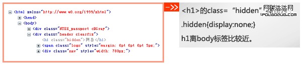 網易將h1設置了display:none樣式,使其隱藏起來,這樣既解決了h1不知道放哪裡的矛盾又起到了SEO優化的作用,可謂一箭雙雕。