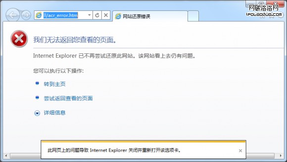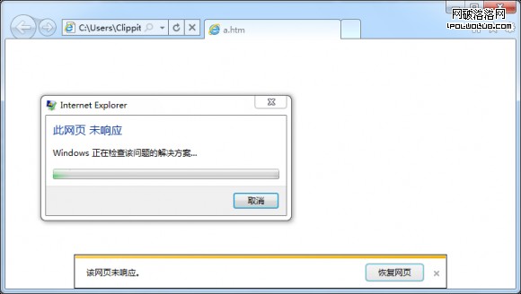 這個bug幾乎存在於現在流行的所有IE版本,從IE6到剛剛發布的Internet Explorer 9的第6個平台預覽版。在IE6中,該頁面往往顯示為空白,但是整個窗口都無法交互。在IE8中,崩潰來得很徹底。而IE9 Beta增強了堅固性,經過我的實測,這個頁面又是會導致整個進程無響應,而有時IE9會提示你網頁存在的問題,但是這都無法避免崩潰的現實。