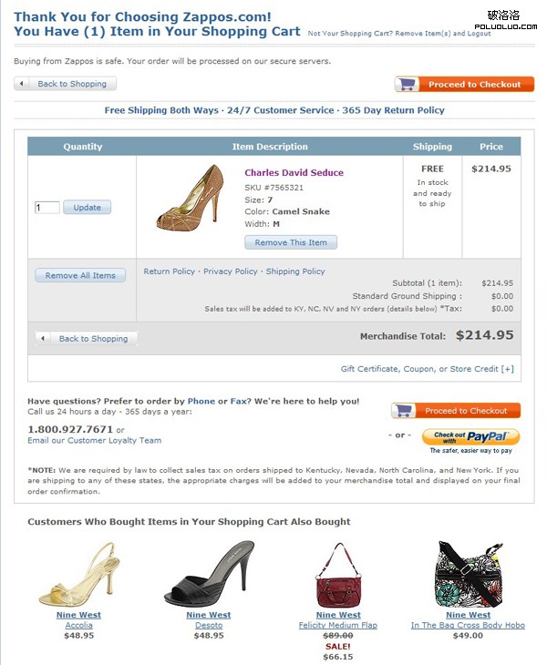 我們看到zappos的購物車頁面除了正常的購物車功能之外,在下面有幾個產品,Customers Who Bought Items in Your Shopping Cart Also Bought (購買了你購物車內產品的顧客還購買了),這些商品都是為了進行交叉銷售(Cross-Selling),提高每張訂單銷售金額,同時也方便顧客找到其它 合適的產品,挖掘顧客的需求。像zappos這樣,已經做得很不錯了,國內很多B2C網站的購物車內根本都不做交叉銷售的推薦。
