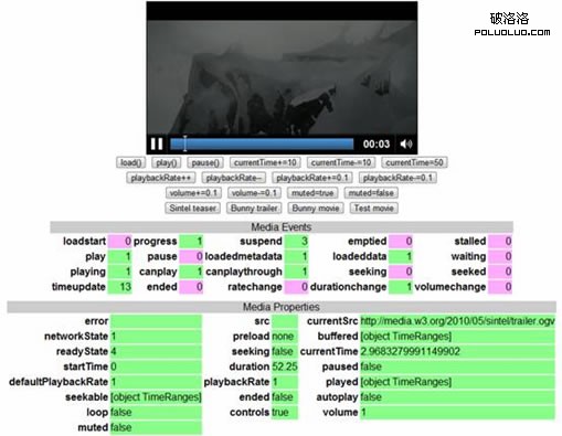 W3C網站上有一個關於HTML 5視頻的舉例,很好的說明了所有前面介紹的標簽的使用,屬性和方法以及事件的應用,非常直觀。隨便還可以通過這個頁面查看浏覽器對HTML 5視頻各個方面的支持情況。