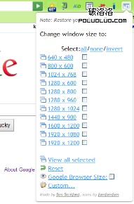 另一個有用的擴展包Resolution Test,它可以改變浏覽器窗口大小,從而使網站開發者可以在不同的屏幕分辨率下預覽網站。它包括一個常用分辨率列表,以及可以輸入您自己的分辨率的定制選項。
