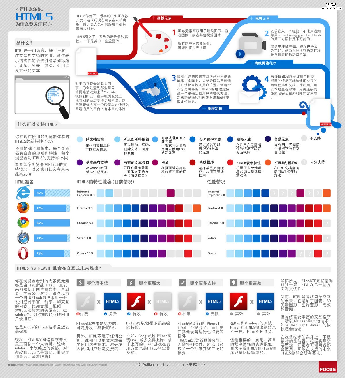 來自Focus.com, 《HTML5是什麼》是一幅很酷的HTML可視化的解說,分析了各種浏覽器的支持,以及和Flash的各種對比。從圖形信息設計的角度來看,我不喜歡顏色組分析浏覽器性能的那塊,不應該讓我回頭來看對比顏色,看哪個浏覽器缺失了哪個性能。