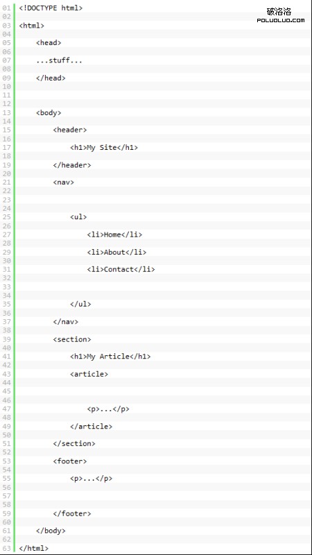 非常清楚,並且容易理解,不是麼?一些注釋:我們可以在header標簽中包含我們 的<h1>My Article</h1>標題。我沒有這樣做,因為h1元素已經表達了標題的含義,但如果你還有發布日期,署名或者其他數據在你文章的頂部, 為標簽集添加一個header容器標簽是一個很好的選擇。