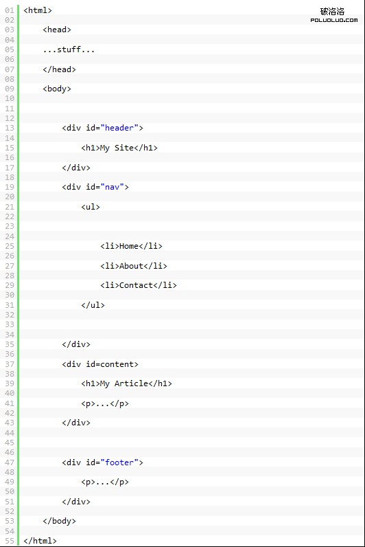 上面的例子中,我們為我們所有的結構div添加了ID。這在有見識的設計師中是很平常的事。目 的有兩個方面,首先,ID提供了可以能用於給頁面的特殊段落應用樣式的錨,其次,ID充當基本的偽語義結構。高明的解析器將會查看標簽的ID屬性,並嘗試 去猜測他們的含義,但當每個站點的ID名稱不同的時候很難。