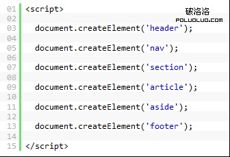 我們只需要讓IE去給我們使用createElement方法創造的的HTML 5標簽設置樣式。在HTML 5文件的head標簽內添加這點東西。或者,你可以把他保存在一個特定的文件裡,並用這種方法包含。