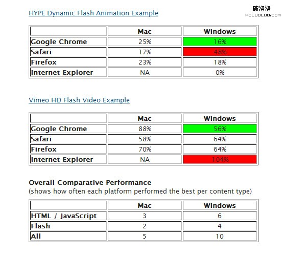 這個爭論由來已久,Flash 被某些開發設計者濫用導致一些網頁加載緩慢,而 HTML5 為之帶來一線曙光。拿仍在襁褓中的 HTML5 和已經有10年歷史的 Flash 進行比較也許有失公允,但這是人人都關心的一個問題。相對 Windows 用戶來說,Mac 用戶可能會從 HTML5 獲得更多好處,因為蘋果一直不願支持 Flash。下面是 Mike Chambers 針對 Mac 和 Windows 平台浏覽器的 CPU 負載而做的一部分測試: