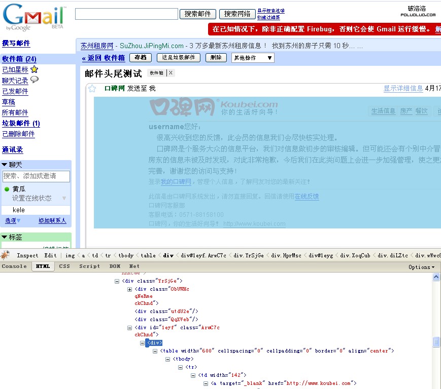第一類包括gmail、hotmail、sohu,這類郵箱,郵件內容是被布局在整個郵箱頁面中的某個div中。如圖: