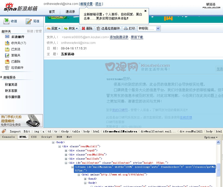 第二類,包括163、sina,這類郵箱,郵件內容被布局在獨立的iframe中。如圖: