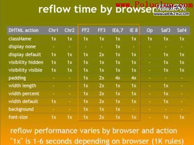 從上表可以很明顯的看出,在所有浏覽器中並非所有 javascript 控制的樣式都觸發 reflow,即使觸發了觸發的次數也不盡相同。同時可以看出現代浏覽器在控制 reflow 次數方面做的越來越好。