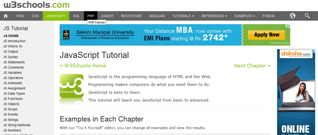 W3Schools是個非常出色的網站,能夠幫助大家以在線方式免費學習JavaScript應用。其中的教程在設計思路上涵蓋了JavaScript語言的各項基礎及高級主題。教程中的每個章節都允許學習者親手執行操作,並立即看到自己的操作在JavaScript當中會產生怎樣的結果。