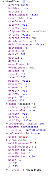 從上面輸出得出,可以使用非標准的DOMMouseScroll事件取代mousewheel,使用事件對象的detail屬性取代wheelDetal。但是,detail屬性值的縮放比率和正負符號不同於wheelDetal,detail值乘以-40和wheelDetal值相等。
