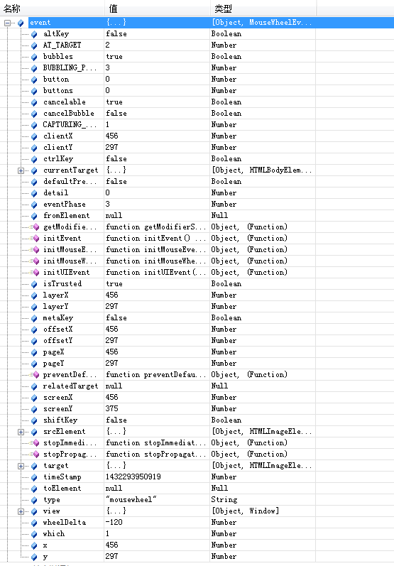 1 2 3 4 document.body.onmousewheel = function(event){ event = event || window.event; console.dir(event); }Firefox不支持mousewheel