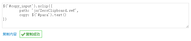 當點擊“復制內容”時,調用zclip插件,並提示復制成功,請看代碼: