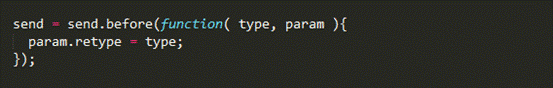 我們遇到過很多跨域的請求, jsonp和iframe都是很常用的方式. 之前在我們的項目裡,用參數retype=jsonp表示是jsonp請求, retype=iframe表示是iframe請求. 除此之外這2個請求的參數沒有任何區別. 那麼可以用before把retype參數動態裝飾進去.