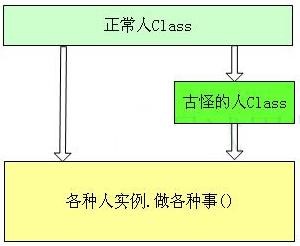 這裡的"古怪人"繼承自"正常人"的時候,是通過代碼重寫的方法來達到重載的目的,這裡明顯違反了非侵入性原則。再來看AOP的思路: