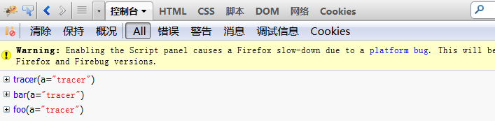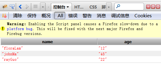 1 2 3 4 5 6 7 8 9 10 11 12 13 14 15 16 var people = { flora: { name: 'floraLam', age: '12' }, john: { name: 'johnMa', age: '45' }, ray:{ name:'rayGuo', age:'22' } }; console.table(people);火狐的控制台: