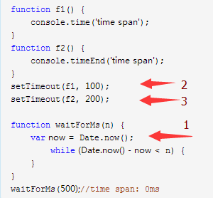 1 2 3 4 5 6 7 8 9 10 11 12 13 14 15 function f1() { console.time('time span'); } function f2() { console.timeEnd('time span'); } setTimeout(f1, 100); setTimeout(f2, 200); function waitForMs(n) { var now = Date.now(); while (Date.now() - now < n) { } } waitForMs(500);//time span: 0ms我們先說說關於console的高級操作,最後在一起分析這道題目。