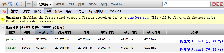 1 2 3 4 5 6 7 8 9 10 11 function parent() { for (var i = 0; i < 10000; i++) { childA() } } function childA(j) { for (var i = 0; i < j; i++) {} } console.profile('性能分析'); parent(); console.profileEnd();上述代碼計算console.profile('性能分析');和console.profileEnd();之間,代碼塊中涉及的函數的運行效率。