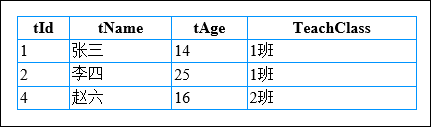 [{"tId":1,"tName":"張三","tAge":14,"tClass":1,"TeachClass":{"cId":1,"cName":"1班"}},