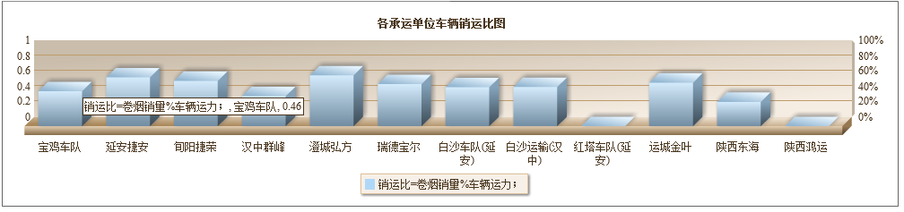 1 2 3 4 5 6 7 8 9 10 11 12 function showChart4(names,values){ var chartObj = new ChartObject(); var xmlString=""; chartObj.caption="各承運單位車輛銷運比圖 "; chartObj.showValues='0'; chartObj.showLabels='1'; chartObj.sNumberSuffix='%25'; xmlString = chartObj.createDualYMSColumnXmlByValues(names,values,"","銷運比=卷煙銷量%車輛運力;",""); var chart = new FusionCharts("Charts/MSColumn3DLineDY.swf", "ChartId2", "1000", "230", "0", "0"); chart.setDataXML(xmlString); chart.render("chartDiv2"); }4、在jsp頁面中只需寫入:
