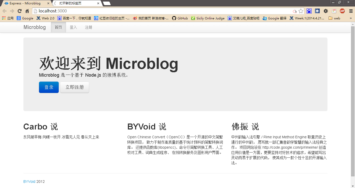 為了開始學習nodejs,一開始選擇了《深入淺出nodejs》這本書,看了幾章之後,得出一個結論是:真是一本好書,但是還是不會寫nodejs!然後選擇了另外一本教材《nodejs開發指南》,由於看過了《深入淺出nodejs》,直接跳過了這本書的前幾章,寫起了該書第五章的微博實例。作為一個新手,在寫的過程中,才逐漸發現因為express版本升級的原因,書中的代碼很多已經不能用了,這對於新手來講,真是痛苦的經歷!!本著分享和學習的精神,特此奉上《nodejs開發指南》微博實例express4.x版本源碼和編寫過程中需要注意的問題。