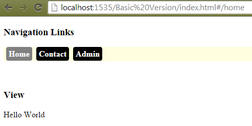 ? 1 2 3 4 5 6 7 8 9 10 11 12 13 14 15 16 17 18 19 20 21 22 23 24 25 26 27 28 29 30 31 32 33 34 35 36 37 38 39 40 41 42 43 44 45 46 47 48 49 50 51 52 53 54 55 56 57 58 59 60 61 62 63 <!DOCTYPE html> <html> <head> <title>JavaScript Mvc</title> <script src="jsMvc.js"></script> <!--[if lt IE 9]> <script src="jsMvc-ie8.js"></script> <![endif]--> <style type="text/css"> .NavLinkContainer { padding: 5px; background-color: lightyellow; } .NavLink { background-color:black; color: white; font-weight:800; text-decoration:none; padding:5px; border-radius:4px; } .NavLink:hover { background-color:gray; } </style> </head> <body> <h3>Navigation Links</h3> <div class="NavLinkContainer"> <a class="NavLink" href="index.html#/home">Home</a> <a class="NavLink" href="index.html#/contact">Contact</a> <a class="NavLink" href="index.html#/admin">Admin</a> </div> <br /> <br /> <h3>View</h3> <div view></div> <script> jsMvc.AddRoute(HomeController, 'home', 'Views/home.html'); jsMvc.AddRoute(ContactController, 'contact', 'Views/contact.html'); jsMvc.AddRoute(AdminController, 'admin', 'Views/admin.html'); jsMvc.Initialize(); function HomeController(model) { model.Message = 'Hello World'; } function ContactController(model) { model.FirstName = "John"; model.LastName = "Doe"; model.Phone = '555-123456'; } function AdminController(model) { model.UserName = "John"; model.Password = "MyPassword"; } </script> </body> </html>上面的代碼有一段包含一個為IE的條件注釋。