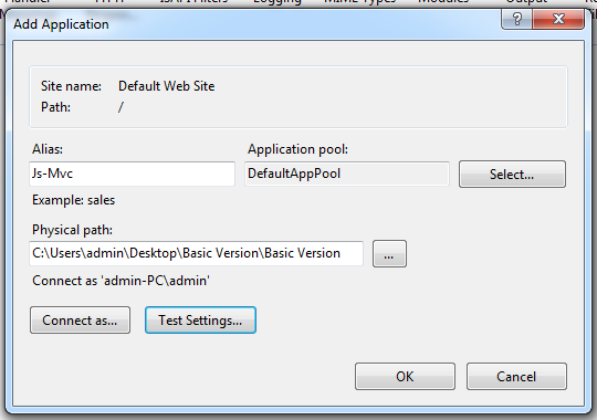 然後設置必填信息:別名,物理路徑,應用池,用戶認證信息,點擊OK。