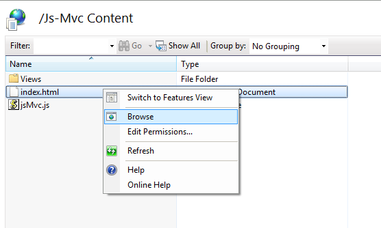 跑在服務器裡是必要的,因為代碼加載從存儲於外部文件中的視圖,浏覽器不會允許我們的代碼在非宿主服務器環境下執行。當然如果你使用Visual Studio那麼直接在目標html文件上右鍵,選擇‘View In Browser'即可。