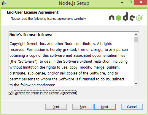 步驟2:點擊Next、顯示Node.js的許可協議頁面: