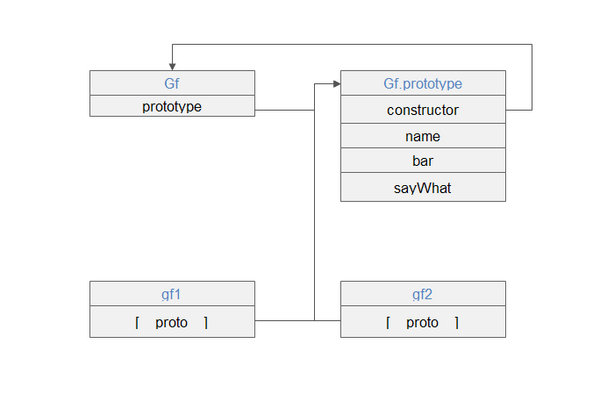 1 2 3 4 5 6 7 8 9 10 function Gf(){ Gf.prototype.name = "vivian"; Gf.prototype.bar = "c++"; Gf.prototype.sayWhat = function(){ alert(this.name + "said:love you forever"); } } var gf1 = new Gf(); gf1.sayWhat(); var gf2 = new Gf();和構造函數不同的是這裡新對象的屬性和方法是所有實例都可以共享的,換句話說gf1和gf2訪問的是同一份屬性和方法。原型對象中除了我們賦予的屬性外,還有一些內置的屬性,所有原型對象都具備一個constructor屬性,這個屬性是一個指向包含prototype屬性函數的一個指針(敢不敢再繞點!)。通過一幅圖我們來清楚的理一下這個繞口的流程: