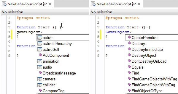 U3D內置的代碼有個命名規則,開頭第一個字母大寫的詞組都屬於類或者函數,而開頭小寫的詞組則是變量。新手經常會混淆它們之間的區別。簡單說來,函數詞組可以作為變量的類型,還可以直接執行功能,詞組後必接成對小括號;變量是對應函數的分支,實現的是對一個具體屬性的控制。例如: