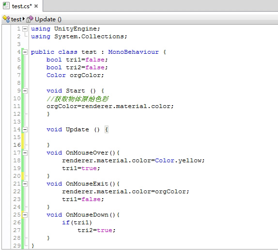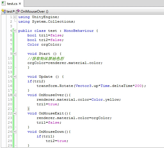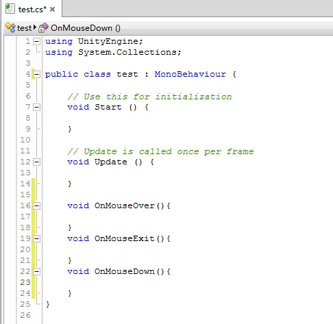 5.加入鼠標相關函數,這裡我需要用到OnMouseOver,OnMouseExit,OnMouseDown。此類特殊函數不會有智能拼寫出現。