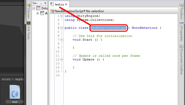4.給腳本命名,然後再雙擊開啟腳本編輯工具(如果腳本名稱和內部的類名稱不同,一定要更正)。