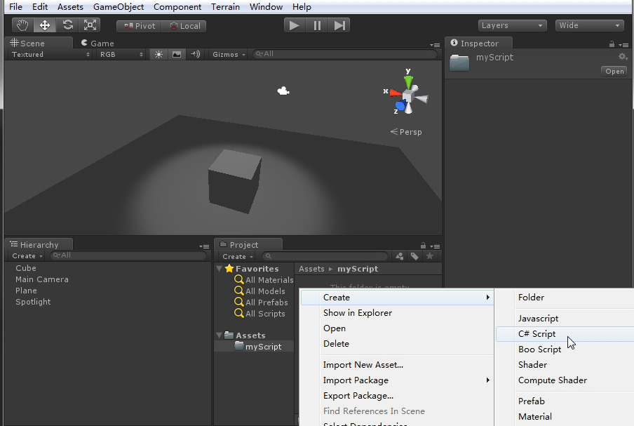3.雙擊進入myScript文件夾,創建一個C#腳本。