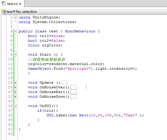 10.GUI的使用。要在游戲視圖顯示各種UI信息,都需要使用U3D的UI組件或者GUI函數。為方便閱讀,我將其他函數的內容收起,並使用GUI函數的Label創建簡單的文字顯示功能(有關GUI更多的詳細信息,請參閱官方文檔,我會在後面再做討論)。