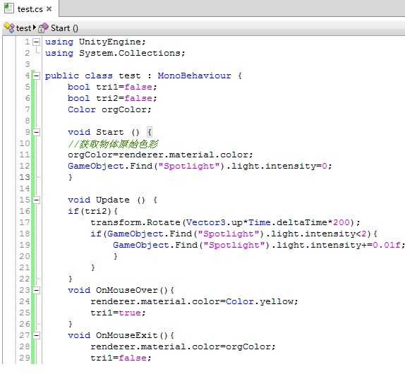 float LightInt =GameObject.Find("Spotlight").light.intensity。如果在Start函數中初始化,Update中就不必每幀執行查找函數,降低游戲效率。不過這裡作為一個測試,我也就很省事的忽略了。