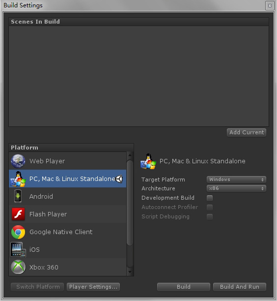 12.發布。執行File->BuildSettings,開啟發布界面。設置好要發布游戲的平台以及一些發布的信息,點擊Build按鈕即可發布一個完整的游戲客戶端。U3D支持發布的平台與用戶授權和操作系統有關,如IOS游戲需要MAC平台的U3D才能發布,Android需要在系統安裝安卓SDK包,次世代主機平台則需要用戶向官方購買額外解決方案。