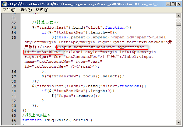 $(this).parent().append('<span id="span"><label style="margin-left:6px;margin-right:4px;" for="txtBankNew">開戶銀行</label><input runat='server' id='txtBankNew' type='text' /><label style="margin-left:6px;margin-right:4px;" for="txtAccountNew">開戶賬戶</label><input type='text' id='txtAccountNew' runat='server' /></span>');