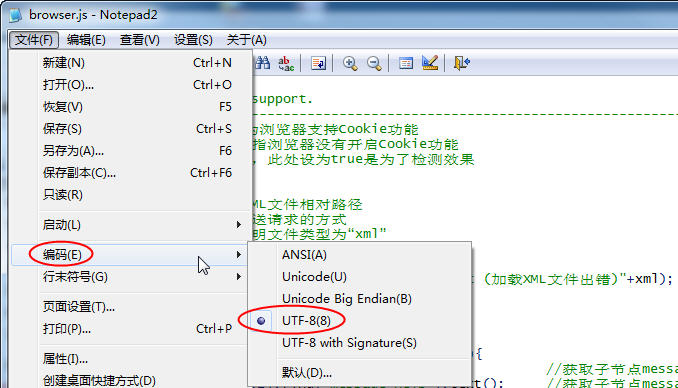 借助NotePad2軟件,將JS文件的編碼轉換成UTF-8編碼,因為UTF-8編碼是計算機通用編碼,能支持幾乎所有國家或地區的語言文字,而且浏覽器本身就支持UTF-8編碼。