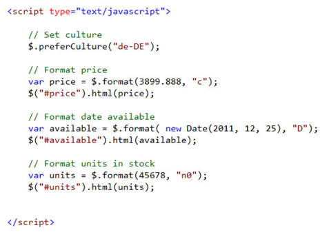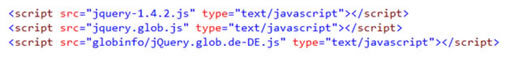 在上例中,我將包含了德語文化習慣的jQuery.glob.de-DE.js文件靜態地加入到網頁中,”de-DE”是語言標記,表示在德國使用的德語。