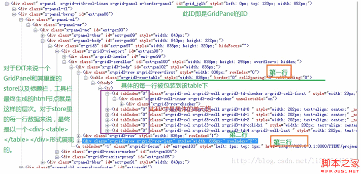 實現依據:Ext中GridPanel容器最終是生成DIV標簽來渲染的,其中我們所看到的每一行記錄,比如:“測試項,0,20”這一行數據就是被“包”在一個div內的一個table。只要我們根據Ext的生成規則找到該table,就可以操作其td元素了。