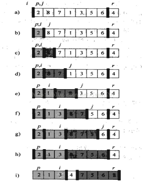 循環過程:j 從2到n,考察j位置的元素,如果大於等於P,就繼續循環。如果小於P,就將j位置的元素(不應該出現在i+1~j這個區間)和i+1位置(交換之後仍在 i+1~j區間)的元素交換位置,同時將i+1.這樣就維持了循環不變量(見上述循環不變量說明)。直到j=n,完成最後一次循環操作。