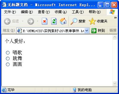 <!DOCTYPE html PUBLIC "-//W3C//DTD XHTML 1.0 Transitional//EN" "http://www.w3.org/TR/xhtml1/DTD/xhtml1-transitional.dtd"> <html xmlns="http://www.w3.org/1999/xhtml"> <head> <meta http-equiv="Content-Type" content="text/html; charset=utf-8" /> <title>無標題文檔</title> </head> <body>個人愛好: <form name="form1" method="post" action=""> <p> <label> <input type="radio" name="RadioGroup1" value="唱歌"onfocus=alert("選擇唱歌!")> 唱歌</label> <br> <label> <input type="radio" name="RadioGroup1" value="跳舞"onfocus=alert("選擇跳舞!")> 跳舞</label> <br> <label> <input type="radio" name="RadioGroup1" value="畫畫"onfocus=alert("選擇畫畫!")> 畫畫</label> <br> </p> </form> </body> </html> 【代碼分析】