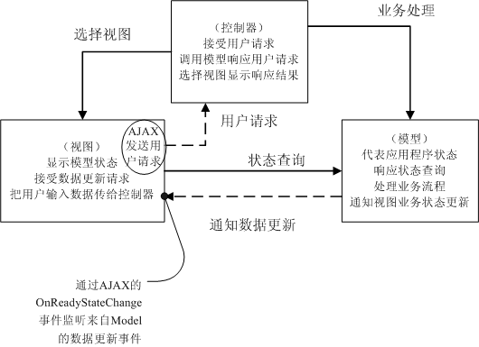 很多人認為在成熟的框架中應用Javascript:void(0);">AJax會破壞框架的完整性,比較常見的說法有三層架構的WEB應用中破壞MVC模式,其實不然。MVC的理論我就不多說了,經典的那三個層、五條線大家都很熟悉,在WEB應用中,因為浏覽器/服務器固有的這種請求/響應的斷開式網絡通訊模式,決定了在Model層無法實現主動向View層發出數據更新事件,所以一般常見的成熟MVC框架中都將經典MVC理論稍作修改:由Model層處理完業務後通知Control層,然後由Control層承擔向VIEw發送數據更新的義務。但是Javascript:void(0);">AJax天生具有監聽功能,Javascript:void(0);">AJax實現異步響應的那個OnReadyStateChange事件就具有在客戶端程序中才會有的事件監聽功能。現在想來,利用Javascript:void(0);">AJax實現的MVC模型有如下圖這樣:
