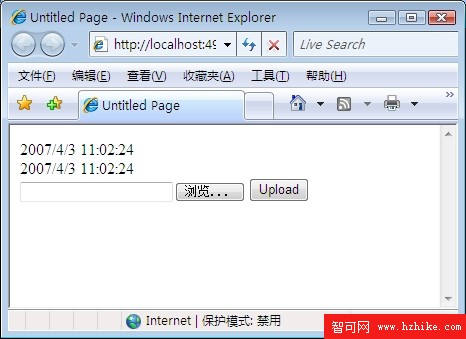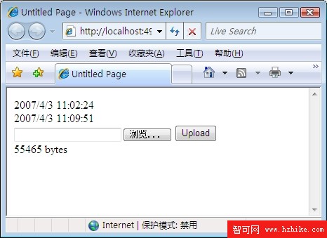 選擇一個文件並點擊Upload按鈕,我們可以發現只有UpdatePanel內部的時間被改變了,文件大小也顯示在了頁面上: