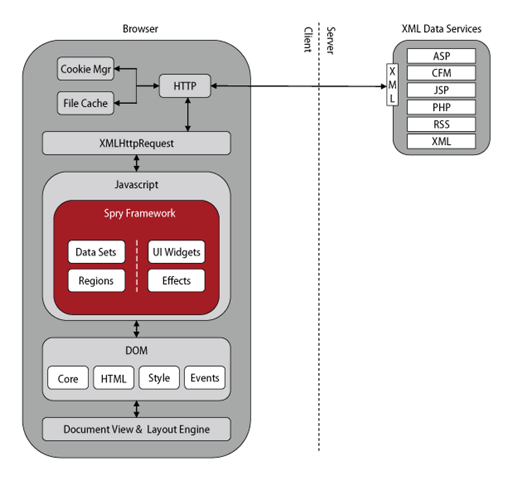 用過Flex的朋友們可以很容易的看出這個Spry框架結構有點像Flex,並且使用HTTPService來與後台服務通訊。的確這個框架感覺每個層面的耦合很松弛,如下圖所示,服務器端可以使用現有的主流技術,展示頁面上可以通過DOM直接整合Html等,是比較容易在現有的系統上改造及嵌入;同時Spry框架的設計目標是Web設計者,對於開發人員來說很容易上手和集成。