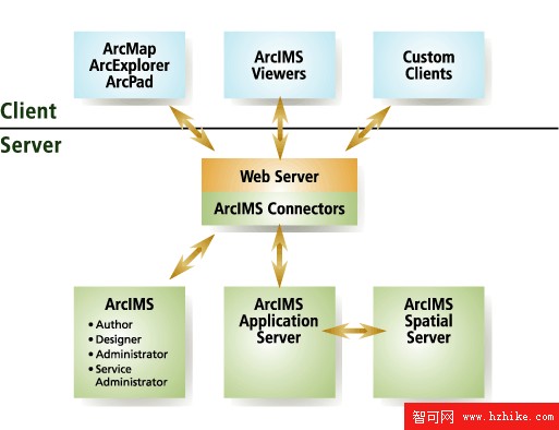 ColdFusion和ActiveX連接器配合自定義的客戶端工作,並且將自己的語言轉換成ArcXML。ArcIMS Java Connector通過JSP客戶端或獨立的Java應用程序和ArcIMS應用服務器保持通信。.Net Link提供TCP/IP或HTTP連接到應用服務器。